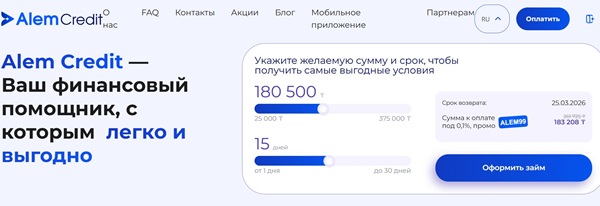 - Перейдите на официальный сайт сервиса alemcredit.com